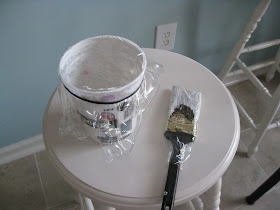 Instead of washing the brush and pouring the ceiling paint back in the can, I covered them both in plastic wrap and used an elastic hairband to keep the paint cup airtight...a little trick I learned on Pintrest. The plastic wrap worked great, my brush was still wet, even after 24 hours!